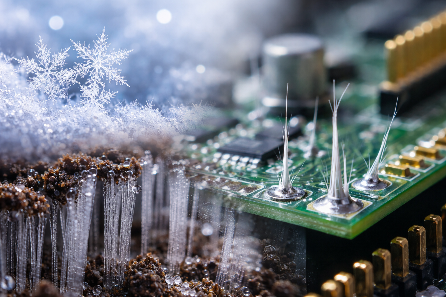 この挙動は、霜柱が地表に沿って広がらず、細い柱として上に伸びる現象と重ねて理解できます。セミナーでは、ウイスカも同様に、内部エネルギーを最も効率よく解放できる経路として、特定方向への成長を選んでいると説明されています。無秩序に見える形状の背後には、常に秩序だった選択があります。