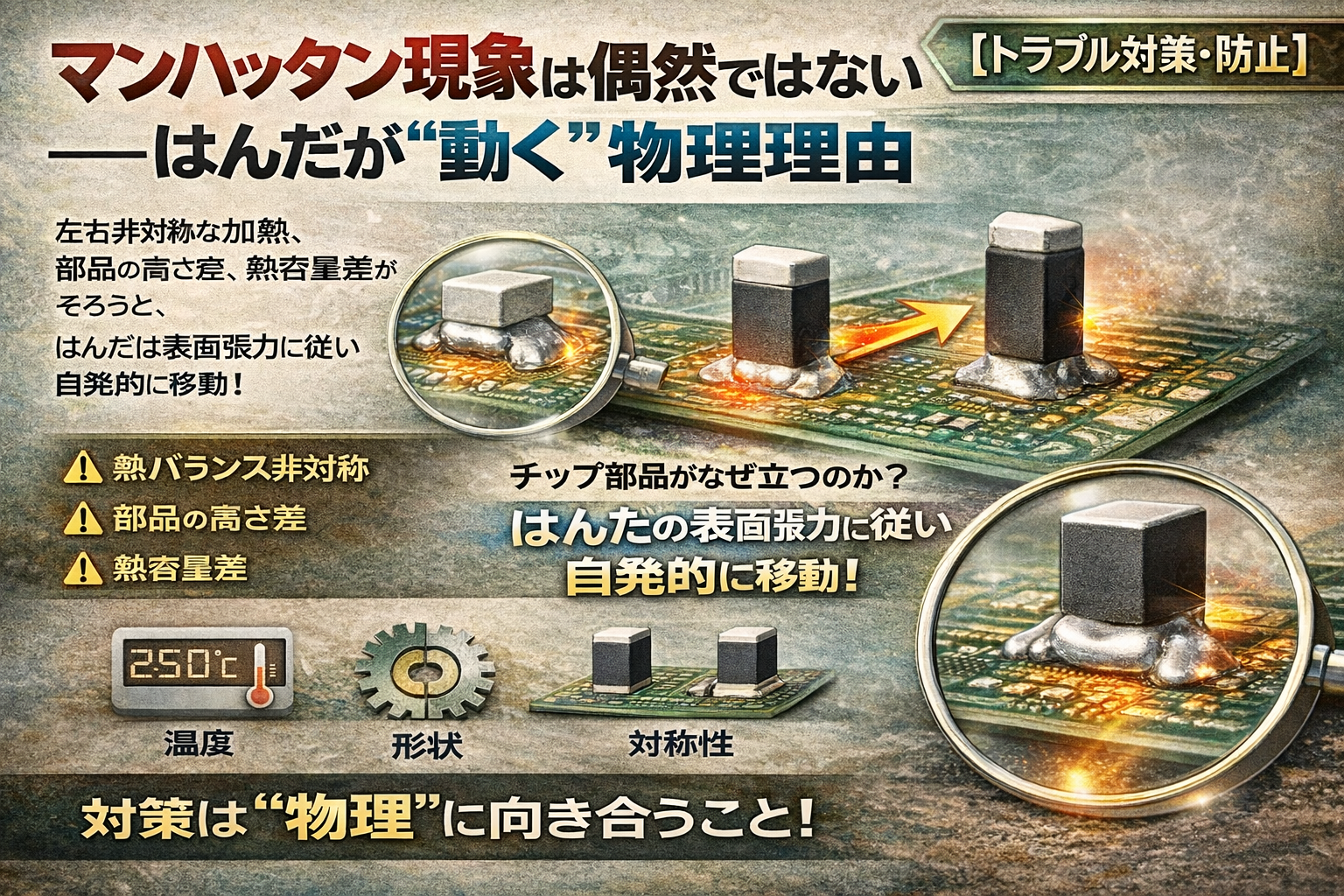 マンハッタン現象は偶然ではない… はんだが“動く”物理理由 未分類 X Facebook はてブ LINE Pinterest コピー 2026.02.04 チップ部品が立ち上がるいわゆる「マンハッタン現象」。 これは、作業ミスや運不運ではありません。表面張力と温度差の必然的な結果です。 左右非対称な加熱、部品高さ差、熱容量差。これらにより、溶融・凝固タイミングがずれると、はんだの修復作用が発生します。 はんだは、表面張力が最小になる形に自発的に移動します。その結果、部品が持ち上がる。これは現象ではなく、物理法則です。 対策は、「押さえる」ことではありません。温度・形状・対称性を設計することです。